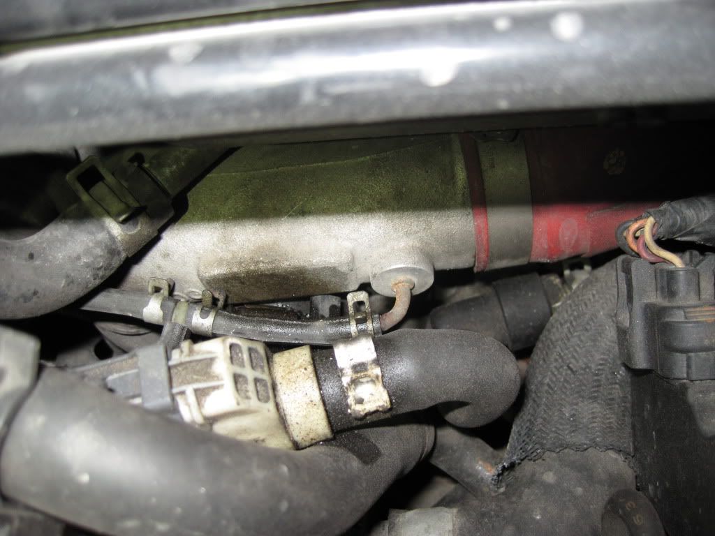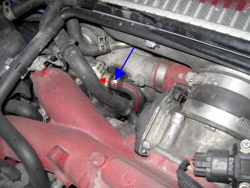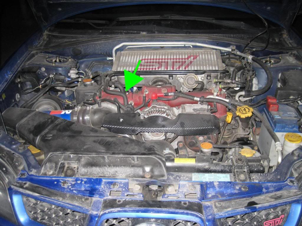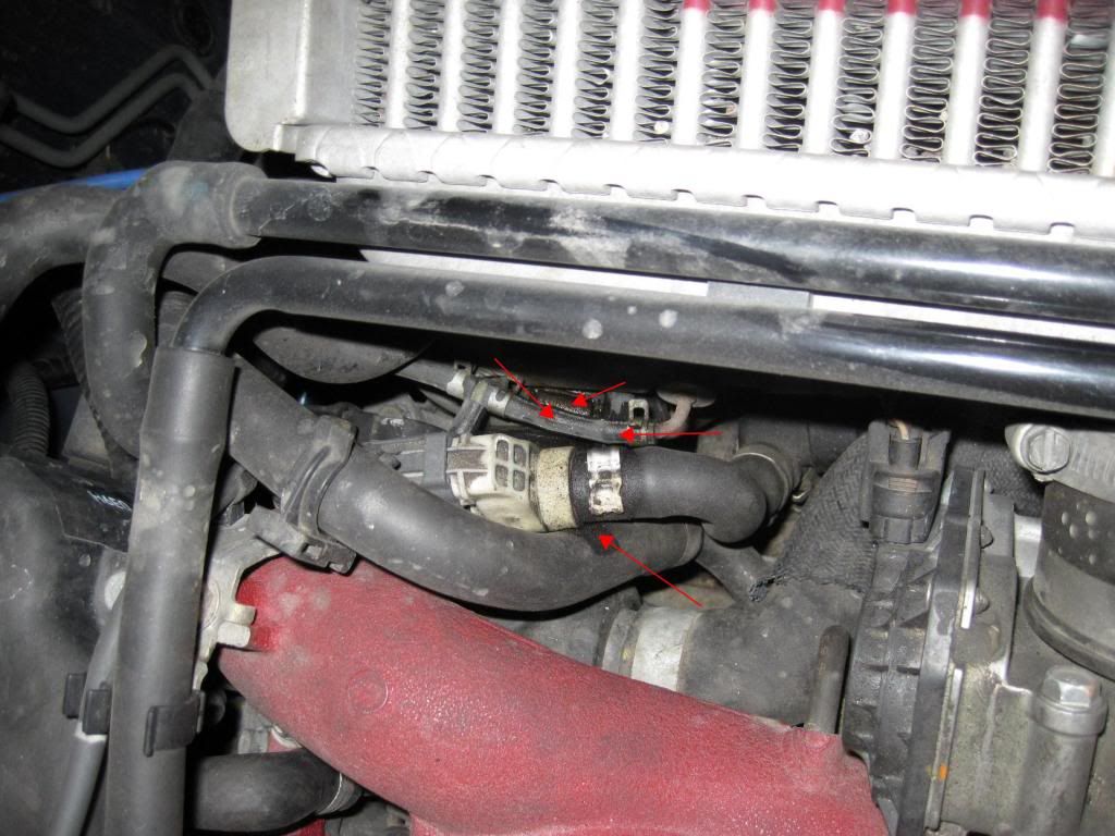 DeltagareRöd pil pekar på turbo elbow, som går under plenum och sitter med en stor slang klamma, mot turbo huset, är säkerligen den som sprukit för dig, om du även får konstiga ljud när du får laddtryck, då sugs den in lite och de blir ett pyss ljud, pröva att trycka lite på den med fingret på den sladriga delen vid turbo, för att se om du ser nå sprickor.