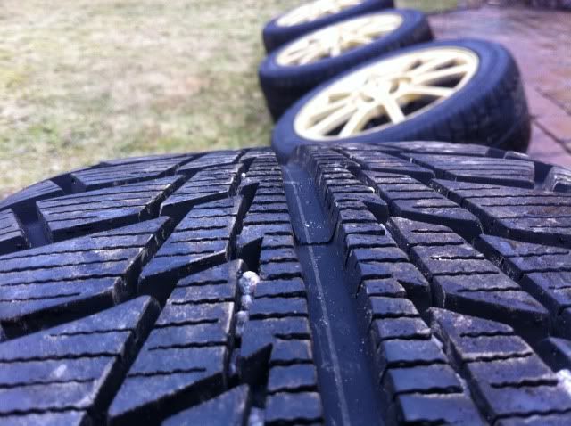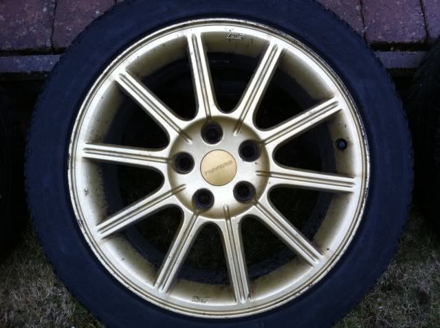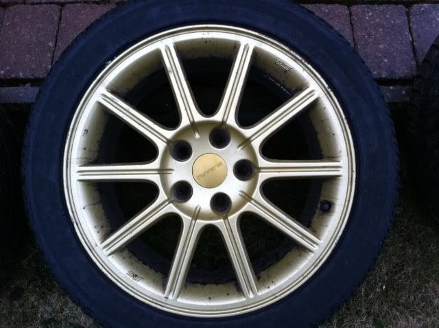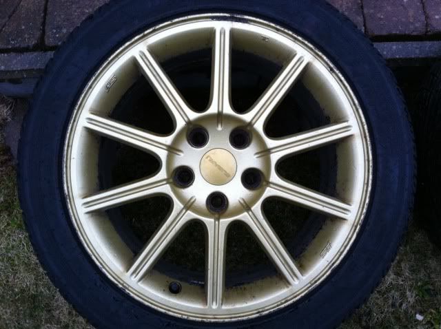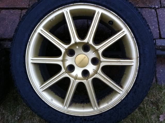 Fälgarna är då ett par orginal guldiga Sti fälgar 17″(inte bbs utan jag tror det är ENKEI då som Pedersen skrev, stämplat STI iaf) med bultdelning 5×114,3 och däcken är Nankang Snow 235 45 17. Kommer från en Sti från 2005.